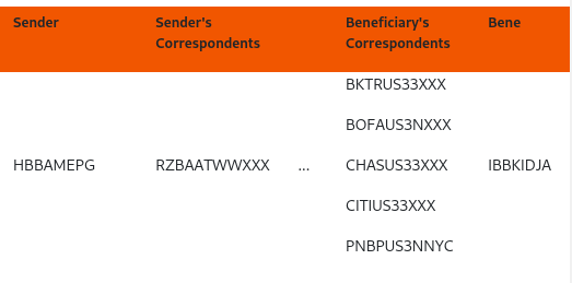 - We don't build the route between correspondent of sender's bank and correspondent of beneficiary's bank. And unfortunately there could be other intermediary banks. For example, for the example below I would assume there is a Standard Chartered in between, because RZBAATWW is located outside of the US and needs a US bank to settle the transaction. We will fix it really soon.